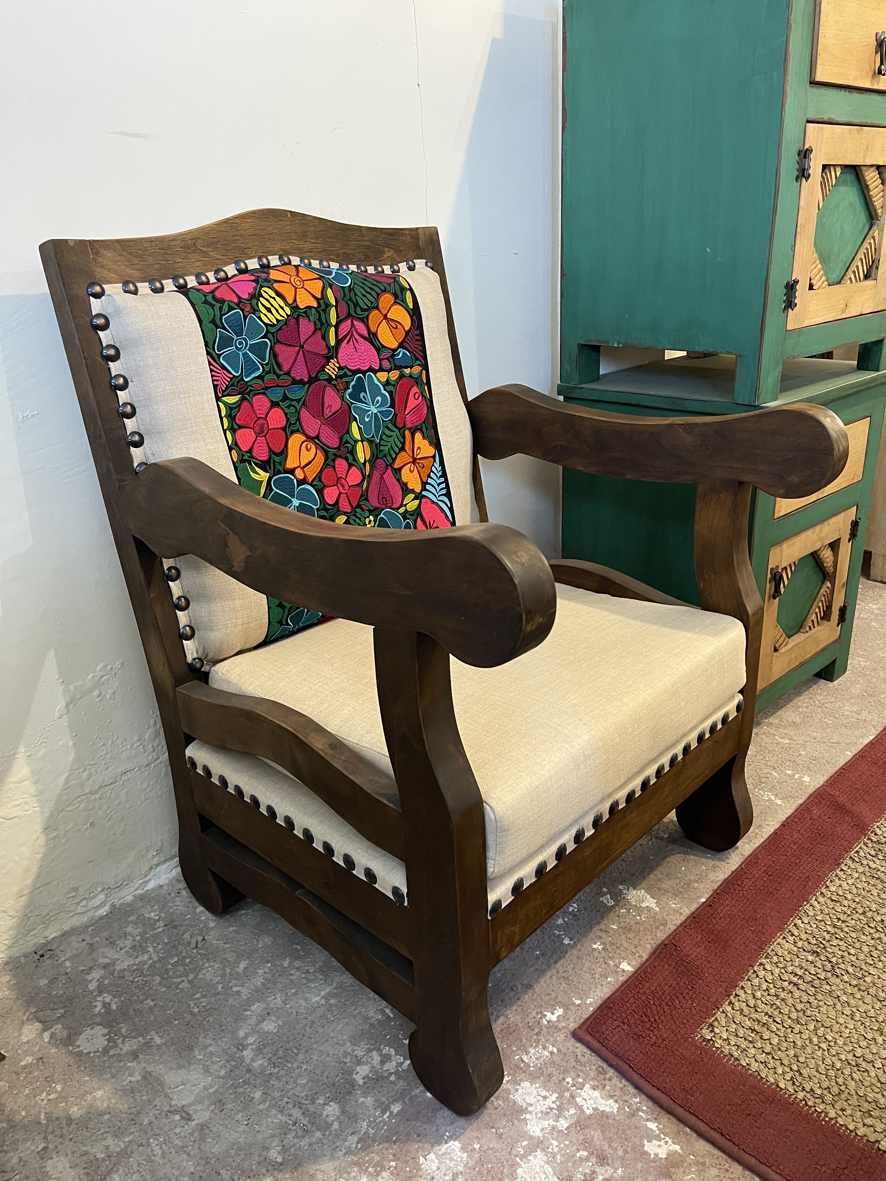 Materiales: Madera Pino con tela en tono beige y bordado mexicano con clavos decorativos