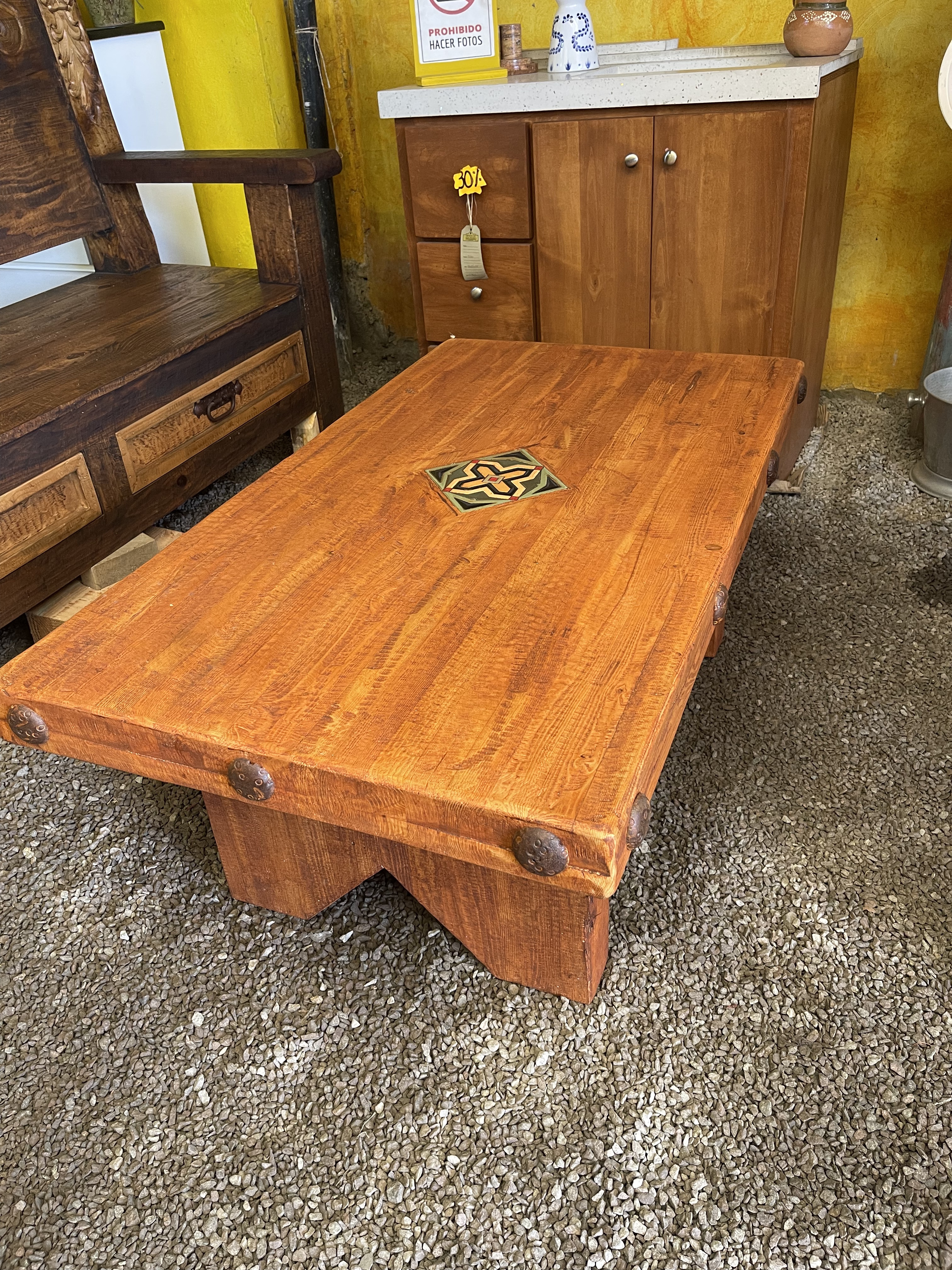 Materiales: Madera pino solido, Clavos de metal decorativos, tile inscrustado.