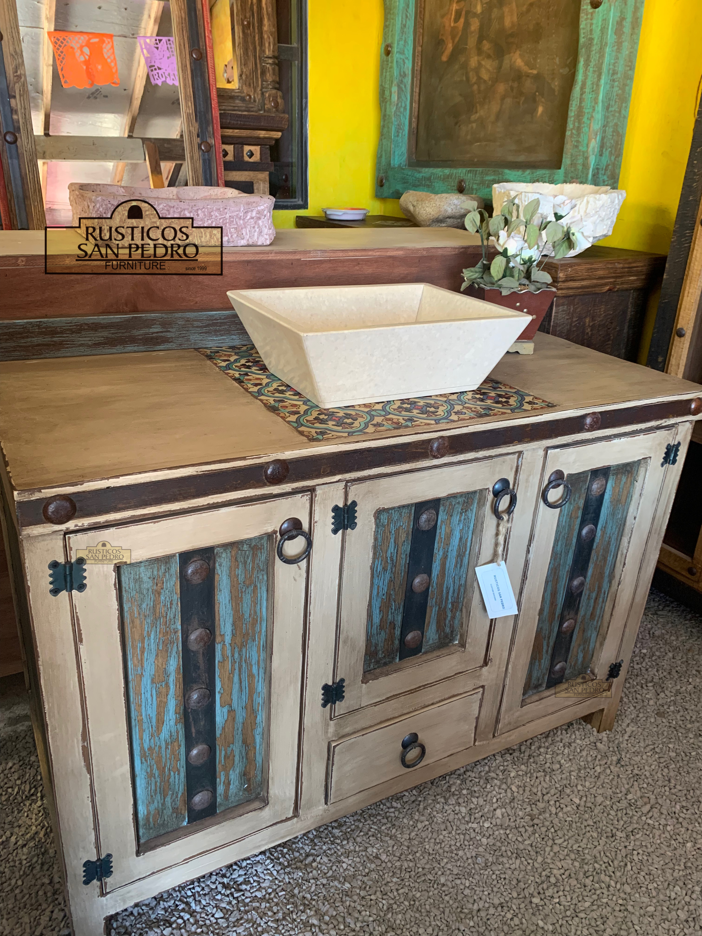 Materiales: Madera Alder solera de metal clavos martillados y tile en la superficie con jaladeras rústicas