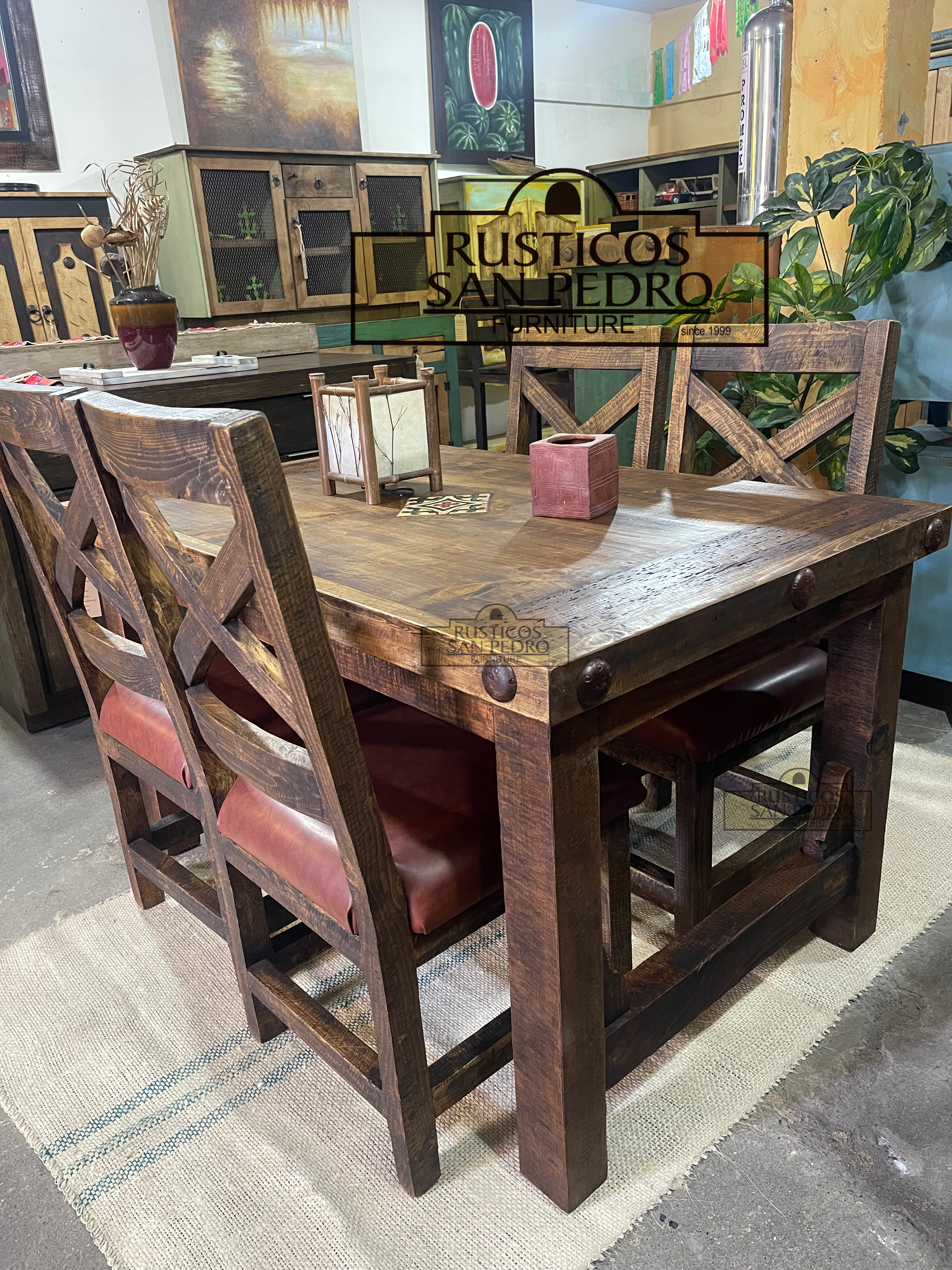 Materiales: Madera pino, clavos de metal decorativos, incrustación de tile, vinilo en sillas.