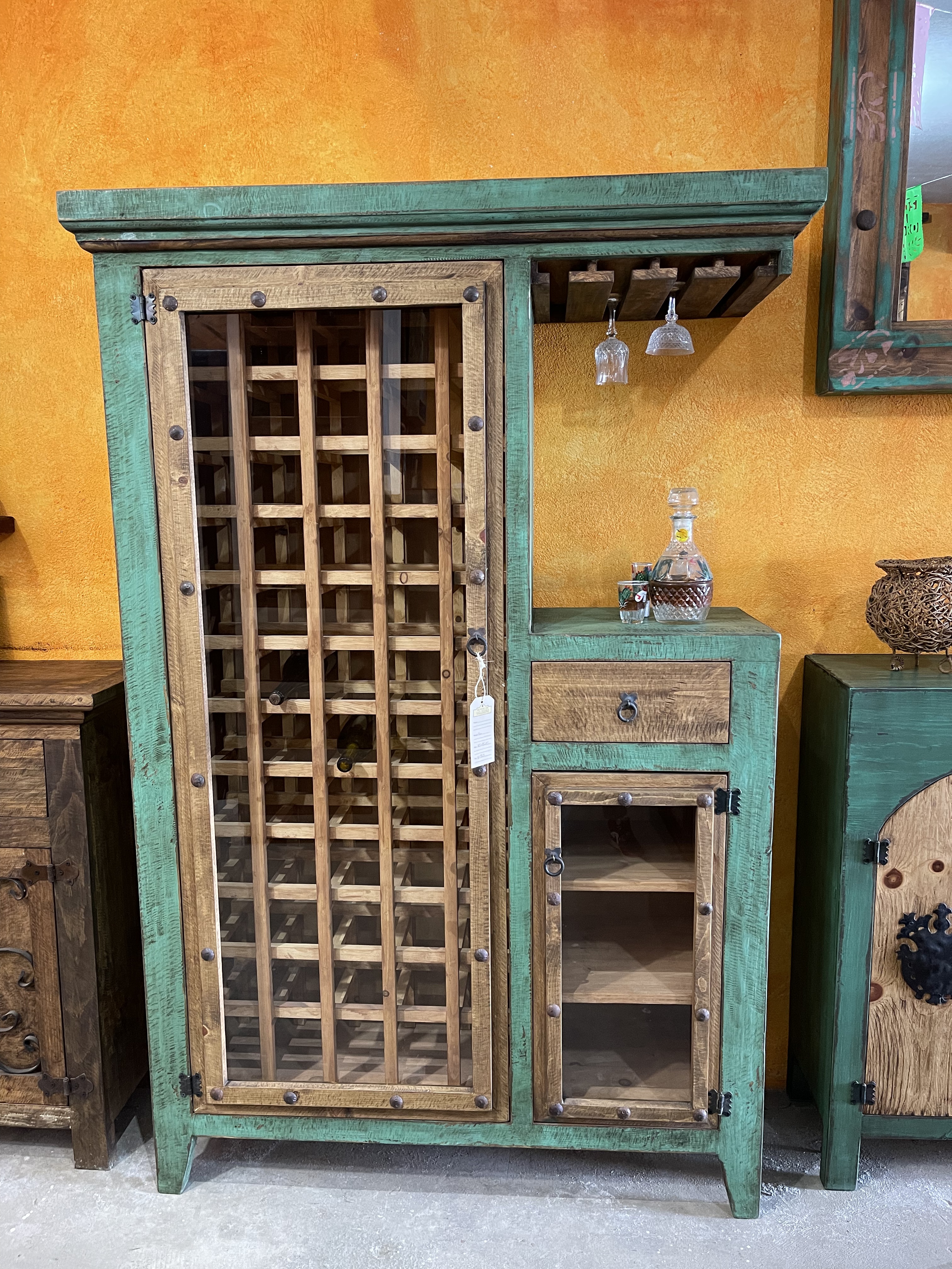 Vinero con espacio de barra y porta copas en madera Pino con detalles de clavo martillado en tono de madera natural y tono verde pistache dos puertas de vidrio y un cajón con suficiente espacio para almacenar .